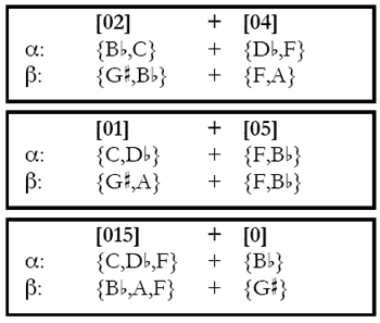 Figure 19. Three ways to split α 4-14 {B,C,D,F}([0237]) and β 4-4 {F,G,A,B }([0125]) into the same pairs of constituent set classes