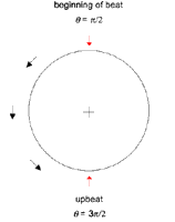 2. The “top” of the beat lies at the top of the circle. There are two logical alternatives to this configuration. The downbeat could lie at θ = 0 (equating the beginning of the beat with the beginning of the arc) or at θ = –π/2 (such that the