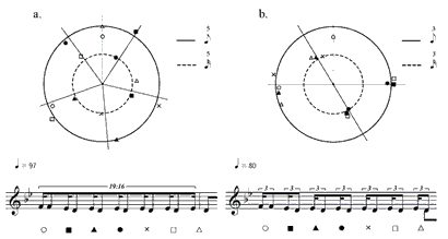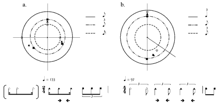 [14] I have shown how the circle graph can serve diverse analytical functions. Its design facilitates understanding of beat subdivision details by making them apparent to the naked eye. Alternate tempos, either stable or fluctuating, can be sought visually to accommodate otherwise intractable rhythms. Lastly, the distribution pattern of points can summarize structural traits exhibited by different rhythmic patterns of any length from a few notes to a multi-measure performance.