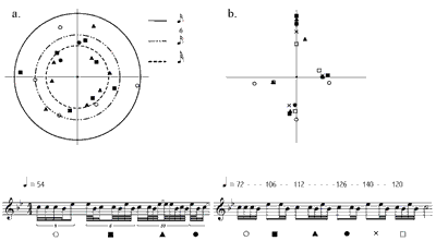 [1] This report presents a graphing method designed to aid the study of rhythm and expressive timing in beat-based music.(1) I show how the polar coordinate system can be used to describe and analyze different features of expressive timing. Numerous studies have shown that expressive timing lies at the core of rhythm production. The evidence—reviewed by Clarke (1999)—confirms that musicians often place attack points along a continuum of beat subdivision values rather than on the predetermined slots afforded by metrical grid spacing, thus imbuing the performance with expressive depth. This departure from a clear-cut temporal lattice is inadequately, if at all, represented by standard music notation. Like the “piano roll” representation used by MIDI sequencers, standard music notation is a kind of visualization tool whose two “axes” capture two paramount features of music: time horizontally and pitch vertically. The need to represent specific aspects of music in a detailed way has led to the design of various visualization methods, as I discuss next.