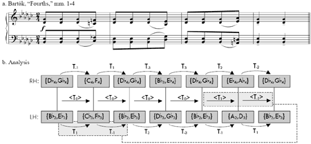 [1] In his article “Reconsidering Klumpenhouwer Networks,” Michael Buchler advocates for a stronger perceptual salience of the types of observations that Klumpenhouwer networks afford. In the course of his critique, he presents two criteria that perceptually salient K-net analyses should meet: they should take place in registral space (henceforth, p-space) to an appreciable degree,(1) and they should not endure the perceptual strain of negative isography, i.e. dual- or hyper-inversions (<In>).(2) The price for the former is an increase in analytical exclusivity, since such relationships do not occur as often in the literature. The price for the latter seems steeper, as Buchler explains: “One could avoid the particular phenomenological problem of dual inversion by resolving to employ only positively isographic K-nets, but doing so effectively forfeits one’s ability to produce recursive network structures, and these are perhaps the greatest incentive for using K-nets in the first place.”(3) Part II of this article presents a K-net analysis of Bartók’s “Fourths” from Mikrokosmos that meets both of these criteria. In using this analysis as part of my pedagogy of K-nets, I am initially willing to pay the price of analytical exclusivity: the student will likely, and correctly, surmise that such a custom-fit analytical method has little significant applicability beyond “Fourths”. (Two other passages from Bartók, for which the method delivers more modest results, will be mentioned toward the end of this article.) However, sometimes I use this payment as an upfront pedagogical investment in the student’s understanding of K-nets, and, if there are any dividends, I use them to fund my promotion of the apperception of pc-space K-nets: “if you can value that in p-space, how about this in pc-space?”(4)