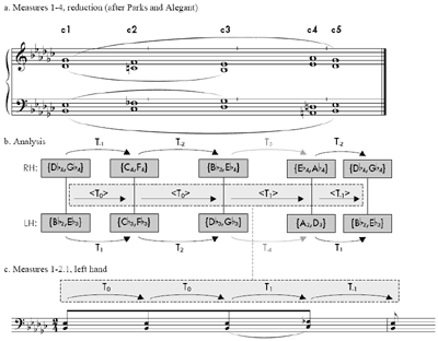 As highlighted with dashed boxes and lines in Figure 2b, the progression of these five chords create a <T0> <T0> <T1> <T-1> hyper-network that matches the T0 T0 T1 T-1 progression of the left hand’s first measure as given in Figure 2c, thus accommodating the distinctive eighth-note repetitions. Furthermore, the isochrony of the first four eighth notes in Figure 1c roughly matches the near-isochrony of the corresponding chords c1-c4 of Figure 1a (note the tick-mark barlines). Parks’s hierarchical analysis of these measures, summarized with the slurs in Figure 2a, supports the “middleground” dual transpositions of Figure 2b to some extent: in particular, the T-1 T-2 progression in the right hand and its mirror in the left correspond with stepwise Terzzugen that prolong the referential sonority.(31) The T5 and, by association, the T-4 however, are more removed from Parks’s hierarchy, in that they cut across it, spanning the gulf between two stepwise voice-leading strata (the passing motion of chords c1-c3 and the neighbor motion of c1, c4 and c5). Therefore, although the T5 and T-4 contribute to the middleground hyper-transposition progression, I have written them in gray, to signify that they cannot be as readily perceived as middleground transpositions as the T-2 and T2 transpositions can be. (This seemingly inconsequential detail will strengthen a match asserted later.) |