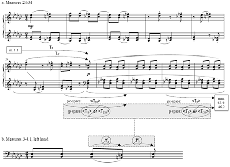 [17] So far, I have demonstrated that the two p-space intervals of a semitone and a minor third, which distinguish mm. 1–3.1, match the two p-space “hyper-intervals” (one and three “notches away,” respectively, from a referential axis) that distinguish mm. 3.4–16. It remains to be demonstrated that the remaining dissimilar melodic interval in the first phrase—the major second—matches the remaining dissimilar “hyper-interval” in the piece. The following imitative section (mm. 17–30) returns to a predominance of <T0> hyper-transpositions in the foreground, relieved by two <T-1>-then-<T1> progressions in mm. 17–21 and mm. 21–25 (not shown) that revisit the same tetrachords from mm. 9–12 and thus perpetuate a match with the right-hand’s T-1-then-T1 sequence from mm. 1–2.1. As shown in the first part of Figure 5a, this section concludes in mm. 24–30.2 with a conspicuous prolongation of the referential sonority and a strict adherence to a registral axis. After an eighth-rest gasp, the music in mm. 30.4–34 returns to the tetrachordal homophony of the opening, compressing the minor-second and minor-third undulations of mm. 1–3.1 into a single measure repeated four times. As shown in Figure 5a, the harmony that initiates the section from mm. 30.4–34 can be considered either as a T-7 of the comparable referential sonority that occurs throughout mm. 25–29, or as a T5 of the very first chord of the piece. |