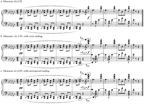 [20] This divergence is even more apparent when comparing the ossia ending to the recomposition in Figure 6c. On the one hand, my staid recomposition maintains not only the same axis, but also the Aussensatz of the previous section (mm. 42.4–46.2); furthermore, the notes of the referential sonority dominate the texture. On the other hand, Bartók’s <T2> merges the left-hand’s D-flat with the right-hand’s E-flat, creating tonal concord and closure on the root of the referential sonority. Hence, whereas the T2 of m. 3 threatened pitch-class duplication, the <T2> of the end embraces pitch-class duplication, and axis centricity gives way to pitch-class centricity.