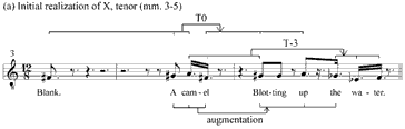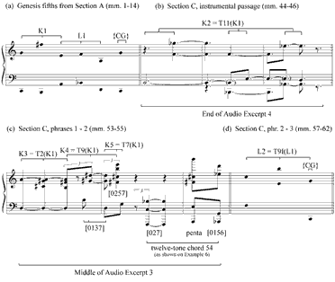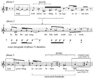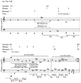 [33] Example 11b helps to point out a profusion of other local relationships that arise from the interaction of the vocal line, the Genesis fifths, and the short-note stream. First, the harmonization of “or intention” fuses two segments that occur separately during “God with whom.” The RT3 transformation of {B E [34] Spontaneous interrelationships also organize the vocal line of Section A2. All-interval tetrachords (that each embed B3, F3, and F [35] Concerning X, the final A3 completes the large-scale T0(X1–3) begun by the striking initial F