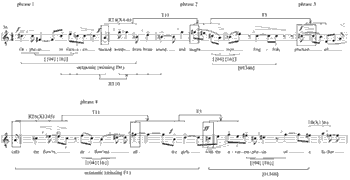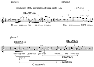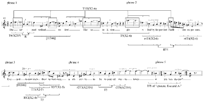 Example 13. X and spontaneous interrelationships in Section B1, [37] Other vocal interrelationships include the pair of RT6-related ordered sets that organize phrase 2, the pair of inversionally-related melodies that connect phrase 2 to phrase 5, and two pairs of T5-related X fragments that generate continuity both within and between phrases 3 and 4.