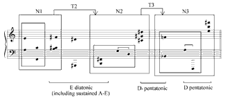 [38] The accompaniment of “perfect Northern exposure” articulates the perfect fifth and X subsets [0146] and [025] on three structural layers (see Example 14). The Genesis and other fifths that saturate the musical surface organize into three transpositionally-related subsets (N1, N2 and N3) each of which builds a fifth on the notes of an [0146] to form [0124789]. N1 for example contains a perfect fifth built on each note of {F F
