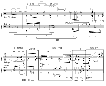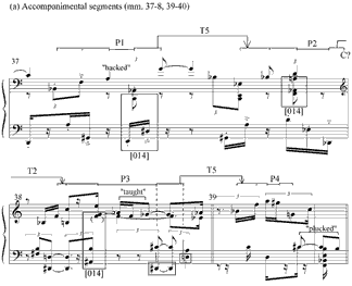 [41] In the absence of simultaneously-struck perfect fifths the accompaniment of this section turns to other methods to provide continuity. First and most simply, (R)T0 relations anchor the “brute sounds” of phrase 1: statements of E–E [42] Second, set types [01258], [012478], and [0124578] cohere phrases 1–3 because each set type occurs more than once and because set-type complementation and inclusion relate these set types to one another Example 15. Section B2, tenor (mm. 36�44)