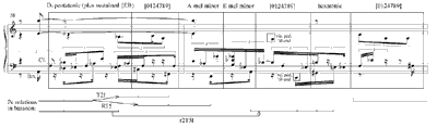 [11] Fourth and finally, in addition to focal pitches and fifth- and X-related structures, Part II of the analysis identifies “spontaneous interrelationships.” Some of these interpret the vocal line alone and others address the combination of the vocal line with the compositional layers outlined above (Genesis fifths, short-note stream, twelve-tone chords) or with other instrumental passages yet to be mentioned. Most of these relationships involve (R)/Tn/I-related ordered, unordered or partially-ordered pitch-class sets that contribute to local continuity: for example, RT6-related five-note ordered sets (that are not subsets of X) constitute phrase 2 of Section B1, unordered set type [0237] structures the Section A1 flourish, and a series of partially-ordered sets, P1–P4, articulates T5–T2–T5, thereby organizing the complex polyphonic texture in the first half of Section B2.(10) These relations are quite straightforward to pull from the texture because most involve pitches that are adjacent, either within a single instrumental line or within the texture as a whole. Relationships that do not involve adjacent pitches are nonetheless prominent because they are articulated by contour maxima and minima (melodic highpoints and nadirs respectively)(11) or reinforced by attack-point rhythm (the ordered series of durations measured from the attack of one note to the attack of the next).