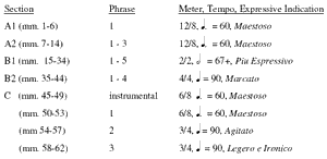 [29] The remainder of the paper combines the presentation of X and spontaneous interrelationships, addressing each of the song’s five sections in turn. Each section treats the vocal line alone first and then studies the interaction of different instrumental strata in the texture as a whole.