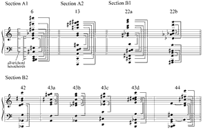[17] RT6-invariant, all-interval, twelve-tone chords also play a prominent role in this song. These chords and some fewer-pc relatives are listed in Example 6. (Chords are labeled by the measure in which they occur and, where two or more chords occur in the same measure, also by letters as with chords 22a and 22b. In some cases all twelve notes in a chord sound simultaneously in the music but in others the chord is a combination of several adjacent events.) Chord 13 is a stereotypical example: it includes each pitch-class interval exactly once (10–9–7–1–8–6–4–11–5–3–2 ordered from low to high), it features tritone nesting (RT6 invariance) shown by nested brackets on the example, and like most others in the song its top and bottom hexachords articulate [013458]. Other chords deviate somewhat from this model. In chords 22b and 52a the hexachords map onto themselves (not each other) under RT6. Chords 42-44 rely on RT6 but do not form complete twelve-tone chords. Chord 44 is two pcs short of the full twelve, chords 43a-d contain pitch classes that do not participate in the RT6 structure, and chord 42’s top hexachord realizes the popular [013458] but its RT6 pair is incomplete.(19) Chord 6’s segmental embedding of the all-trichord hexachord recalls a similar practice in Night Fantasies, the work composed immediately prior to In Sleep, In Thunder.(20) |