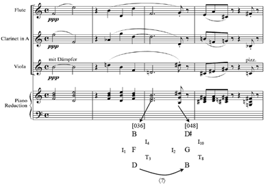 [12] Though the augmented triad is responsible for most of the transformational gaps, trichordal K-nets that are not conventionally or axially isographic are quite rare. If we were to analyze the rest of the trichords in Schoenberg’s “Eine blasse Wäscherin,” network isography will be easily achieved. It should come as no surprise that in all the analyses that use trichordal K-nets, the analyst has presented coherent, transformational pathways since K-net relatedness is so common. Still, there is a definite limit to the abundant isographic relations among trichordal K-nets. But what do these isographic holes tell us about the music it models? As Figure 3 illustrates, all non-isographic progressions include at least one trichord that is symmetrically organized. In addition, non-isographic K-nets will always feature three different voice-leading moves, creating a maximally diverse pitch-class counterpoint. Recall that in Schoenberg’s “Angst und Hoffen,” the opening [048] to [016] progression features a variety of different voice-leading lines, and it is not difficult to imagine Schoenberg choosing two trichords that do not share any similarities; for me, Schoenberg’s diverse voice-leading lines appropriately accompany the words fear and hope of the text. So when it finally happens that K-nets cannot be isographically connected, the transformational paths are momentarily thwarted and the voice leading from one trichord to the next is maximally diverse. Rather than search for cues elsewhere to bridge these transformational gaps, I wish to highlight and celebrate those extraordinarily unique moments when our transformational safety (k)-net has been taken away.