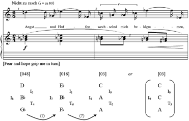 [3] In his first published study of K-nets, David Lewin analyzes a few brief passages from “Eine blasse Wäscherin,” the fourth song from Arnold Schoenberg’s Pierrot Lunaire, op. 21.(3) The Pierrot passages that Lewin analyzes are good ones for illustrating the strengths of a K-net analysis. Lewin effectively demonstrates how to construct coherent, transformational pathways and introduces K-net recursion. But if we analyze the entire song with a K-net lens, we will find that the isographic tools that Lewin introduced cannot relate a few K-nets. [4] Example 1 includes the score for the opening instrumental phrase of “Eine blasse Wäscherin.” Most of the trichords in this passage contain a dyad of interval-class 3, and the K-nets that model these collections could be configured in such a way that T3 and T9 arrows are drawn. From an isographic perspective, virtually every trichordal K-net in this passage is strong, positively, or negatively isographic to its adjacent K-net. In m. 3, however, the K-net that interprets the [036] diminished trichord cannot be isographically related to the K-net that interprets the [048] augmented trichord. Since these two collections do not share an interval class, the K-nets cannot be related by strong, positive, or negative isography. And since these particular diminished and augmented trichords do not share an inversional relationship, they cannot be related by axial isography. As a result, the K-nets that interpret these two collections cannot, in any way, be isographically related. [5] An even more remarkable passage to explore non-isographic K-nets occurs in Schoenberg’s song “Angst und Hoffen” from his Buch der hängenden Gärten, op. 15, no. 7, given in Example 2.(4) The first three collections of the piano accompaniment are members of three different set classes: [048], [016], and [03] respectively. The augmented triad accompanies the word “Angst” while set-class [016] accompanies the word “Hoffen.” The A4/C5 dyad on the downbeat of the second measure accompanies the word “wechselnd.” Throughout the song, the “Angst” [048] and “Hoffen” [016] sonorities alternate with one another, reflecting the anxious longing for love by the narrator. What makes the opening accompanimental passage so remarkable from a K-net perspective is that these three adjacent collections do not share an interval or an inversional relationship, two requirements to ensure K-net relatedness.(5) |