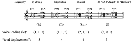 [7] An effective way to measure the voice leading of non-isographic K-nets is to use Joseph Straus’s “total displacement,” which is the sum in absolute value of the three voice-leading moves from one trichord to the next.(7) In Example 3d, the registral voice leading from the “Angst” to the “Hoffen” trichord features three different interval classes (2, 0, and 1), and these three voice-leading intervals sum to a total displacement of 3. A total displacement of three is significant since this is the smoothest possible voice leading for trichordal K-nets that cannot be conventionally and axially isographic. Since non-isographic K-nets will always feature three different voice-leading moves, a total displacement of 0 (0+0+0), 1 (0+0+1), and 2 ((0+1+1) or (0+0+2)) is not possible.(8)