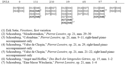 [10] One of the advantages of using Cohn’s DVLS is that it helps catalog the different types of voice leadings for non-isographic K-nets, which I have included in Figure 3.(14) Each DVLS number is paired with its complement and listed along the top. Beneath each DVLS category I have included all set-class pairs that cannot be conventionally or axially isographic. For example, DVLS 0 contains only two set-class pairs that cannot be isographic: [015][036] and [024][036]. What the figure does not tell us is which [015] is not isographic with which particular [036]. Note that each non-isographic progression listed in the figure has at least one symmetrical trichord; these sonorities contain a limited number of different interval classes, which increases the chances that it will not be isographic with its adjacent sonorities. In addition to the symmetrical set classes, another manifestation of symmetry occurs in Figure 3: the trichordal progressions that are listed in DVLS 0 also appear in DVLS 6; the set-class pairs listed in 1/11 also appear in 5/7, and so on.(15)