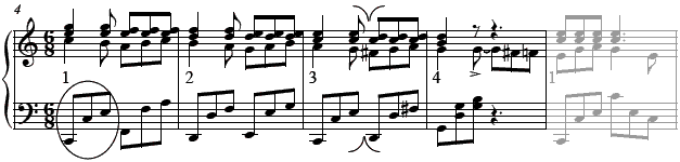 [Circled pitches are a 3rd higher than in m. 4; hypermetric interpretation is given between the staves]