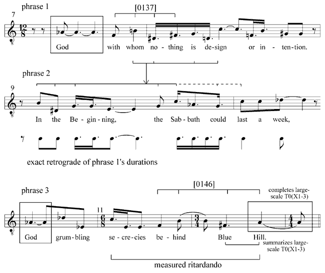 Example 12. X and spontaneous interrelationships in Section A2, tenor (mm. 7–13)