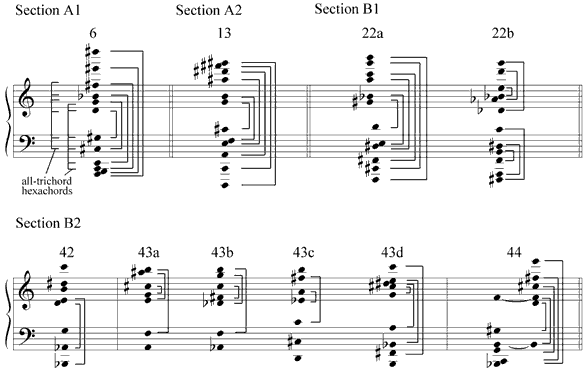Example 6. RT6-invariant, all-interval twelve-tone chords Sections A1–B2 | Section C