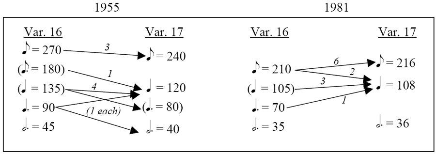 Figure 2. Metric levels, performance tempi, and responses to transition between Var. 16 and 17 (1955 and 1981 performances)