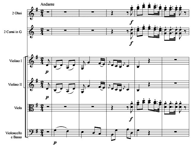 Figure 2. Haydn, Symphony No. 60, beginning of 2nd movement; juxtaposition of cantabile-topic and fanfare-topic