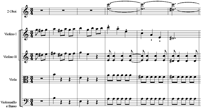 Figure 4. 1st movement, measures 107–111; juxtaposition of bustling-topic and Sturm und Drang-topic (quotation “Farewell” Symphony)