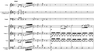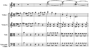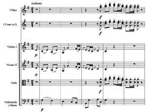 Figure 2. Haydn, Symphony No. 60, beginning of 2nd movement; juxtaposition of cantabile-topic and fanfare-topic (click to enlarge) |