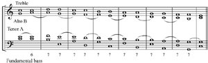 When we give a progression to the part representing this undivided string [i.e. the fundamental bass], it can only proceed by those consonant intervals obtained from the first divisions of this string. Each sound will consequently harmonize with the sound preceding it. As each can bear in its turn a chord similar to the chord obtained from the first divisions, it will easily represent the undivided string, the source and foundation of the chord.(36)