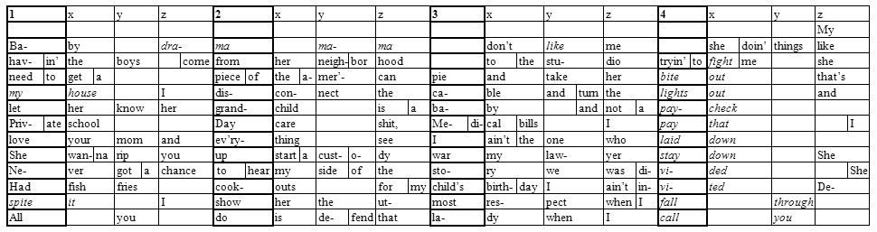[1] “Mrs. Jackson,” also by OutKast, is in a more obvious, and more typical, speech-effusive style. The example below presents a lyric chart for the first verse of this song. (Because this example only serves to illustrate a style of rapping, I have not included the accompanying music.) [2] Note some defining features of the speech-effusive style of the rapper, Big Boi. The rhythm is highly irregular and contains many 32nd notes, which gives the text the quality of very rapid speech rather than rhythmic chanting. It also lends an improvisatory quality to the verse, which is important in a genre that values the ability to “freestyle,” or improvise lyrics over a given beat. Also, accented syllables of words generally do not correspond to accented beats, and vice versa. For example, in the third line, the accented syllables of “neighborhood” and “studio” fall on the second half of beats 2 and 3, while the unaccented word “from” falls directly on beat two; additionally, the word “fight,” presumably the focal point of that line, falls on the second sixteenth of beat four. For much of the verse, the rhyming syllables also have no particular rhythmic relationship either to each other or to the underlying pulse. Having examined this example, it will be clearer why I assert that Big Boi�s use of even sixteenths in �The Rooster� represents deliberate use of a motive. |