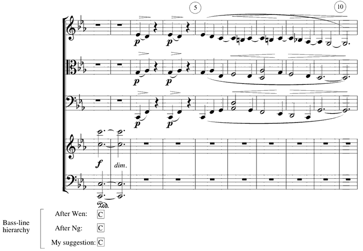 Example 1. Brahms, Piano Quartet No. 3, mm. 1–27, three conceptions of bass line hierarchy