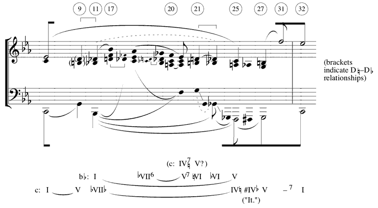 Example 3. Brahms, Piano Quartet No. 3, mm. 1–32, voice-leading sketch