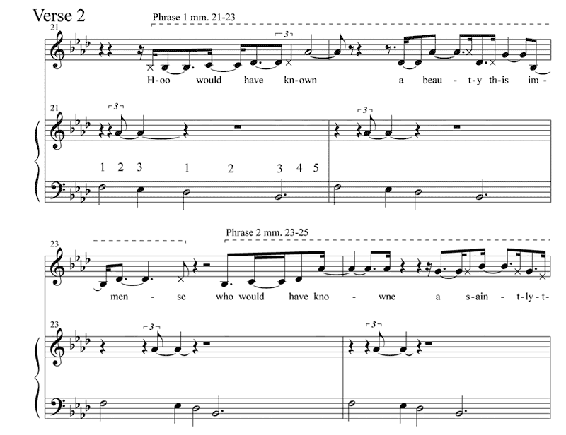 Example 9. Transcription of introduction, verse 1 (mm. 9–17) and verse 2 (mm. 21–29), “Cocoon”