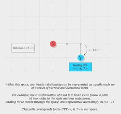[13] To begin answering this question, Animation 3 traces a transformational path for the model progression (PROG. 01, mm. 1–14) through the two-dimensional UTT-network constructed from <−, 4, 5> and <−, 2, 3>. Each chord in the progression appears as a colored node when it begins on the soundtrack. The five UTTs in the series are animated as five changes of location from one node to another, and each is identified (at the arrival of each new chord) in the box labeled “Resulting UTT.” Each change comprises motion along one or both directions, and is summarized at the bottom of the animation as an ordered pair that lists the number of unit steps in each dimension. As in previous examples, each <−, 4, 5>, or its inverse, corresponds to one step to the right or left on the horizontal axis, and each <−, 2, 3>, or its inverse, corresponds to one step up or down on the vertical axis. So the transformation <−, 4, 5> of A major to ![]()