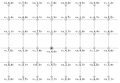[8] Accepting this notion of distance opens the door to further analogies with well-known musical spaces: two-dimensional networks of pitch classes, in which each dimension is generated by a different interval.(7) It is possible to similarly structure the major and minor triads as a multi-path space, where each dimension is generated by a different UTT. Example 5 shows a generic model for creating such a graph. As a reference, the central point is labeled <+, 0, 0>. Nodes to its right and left are generated by the reiteration of a UTT, X and its inverse X−1, and nodes in the vertical dimension are generated by the reiteration of another UTT, Y and its inverse Y−1. Thus every node is labeled with some product of these four UTTs. For the graph to be well formed, X and Y must commute, that is, XY = YX,(8) and to make sure the graph is comprehensive, X or Y must generate all 24 triads. If X and Y belong to K(1,1), these two conditions are easily satisfied. |