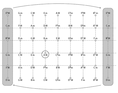 [10] Within this space, any triadic relationship can be represented as a path made up of a series of horizontal and/or vertical steps. I will represent such a path as the ordered pair (a, b), where a and b respectively represent the number of horizontal and vertical steps that constitute it. Because <−, 2, 3> alone generates all 24 major and minor triads, this path could always be completely vertical. For example, the transformation of A major to ![]()