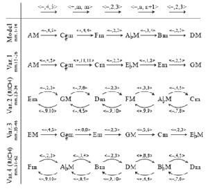 [2] For example, consider the work “A Man in a Room, Gambling” (1992) by the contemporary British composer Gavin Bryars.(1) Its final section (or “programme”) is composed for pre-recorded voice, clarinet, and a string quartet that mostly plays a series of arpeggiating triads. The chord progression of mm. 1–14 is isolated from the rest of the work by a break in texture that ends it, suggesting that it is of some formal significance. Indeed, we shall see that it serves as a harmonic “model” for four other progressions that follow, listed in Example 1. I will therefore refer to these later progressions as “variants” of this model.