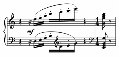 Figure 4. Symphony of Psalms, first movement, piano part starting two measures before R9: explicit presentation of the axis E-G-B-D