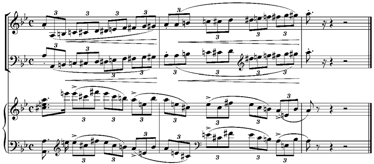 (a) First theme, measures 1–3 | (b) Second theme, measures 12–13 | (c) Transition to second group, measures 51–53