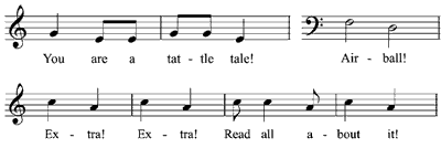 The reader is thus treated to a detailed exploration of the natural horn and its acoustics before the subcategory of horn calls is introduced; the same is true for the ubiquity of the minor third in intoned speech (Example 13) as derived from the pentatonic gap