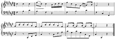 [2] Many of the musical works cited might at first seem out of place in a book dedicated to the pentatonic. It is obvious why Vogler’s Pente chordium is included; the composer scrupulously avoids all of the white keys on the keyboard throughout this work (Example 1). On the other hand, it is more difficult to see why excerpts from Brahms’s Schicksalslied or the quintet from the first act of Mozart’s Die Zauberflöte are cited (Examples 2 and 3).(3) The inclusion of the latter two examples reveals Day-O’Connell’s unique approach to the pentatonic. As he states in his introduction: |