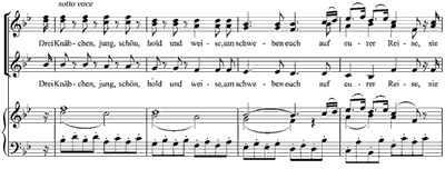 Example 3. Mozart, Die Zauberflöte (1791), I, Quintet, measures 3–10 (click to enlarge and see the rest) |