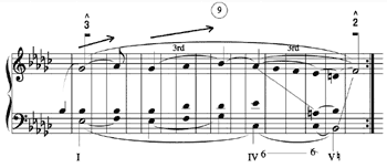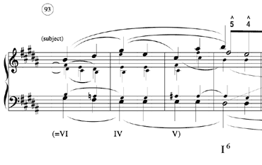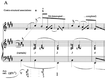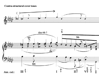 , now emphatically supported by the subdominant. More than that: the slow-motion turn around E gives it an unusually intense focus, like a cinematic close-up.(11) The structural melodic motion responds with shock, jumping register and compensating with an elaborate creep back to the obligatory octave. The lyric codetta finally supplies a resolution to the errant