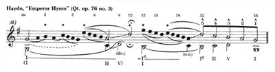 [4] Indeed, there are moments when Schenker can sound a great deal more like Kurth than he would have ever admitted. An example can be found in Schenker’s analysis of Haydn’s Emperor Hymn. In his Tonwille essay, Schenker uses the language of energetics(2) to describe how the process of Überhöhungen (a term translated by Joseph Lubben as “superelevation”) causes the upper voice to surpass the Kopfton D: