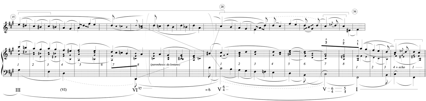 Measures 28–36: Compare the more complete 8-bar unit (with tonic cadence falling on the first bar of the next unit) with the more short-breathed 4-bar units of the opening (and the 8 bars left hanging in measures 15–22). This closing 8-bar unit also reinterprets the opening by placing it entirely within dominant harmony.