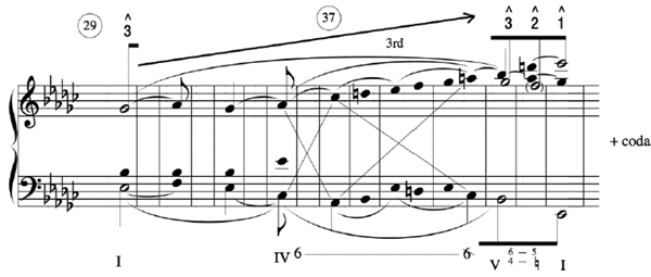 Measures 29–43: The retaking of the opening is actually an amalgam of the first phrase and the rhythmically compressed bars (measures 25–6; compare the sixteenth notes in the durational reduction) of the middle section; the displacement of these bars to the second beat plus the addition of the requisite final tonic fills out the expected hypermetric length.
