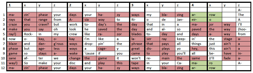 Example 2b. “Blazing Arrow,” verse 1, with rhymed syllables highlighted