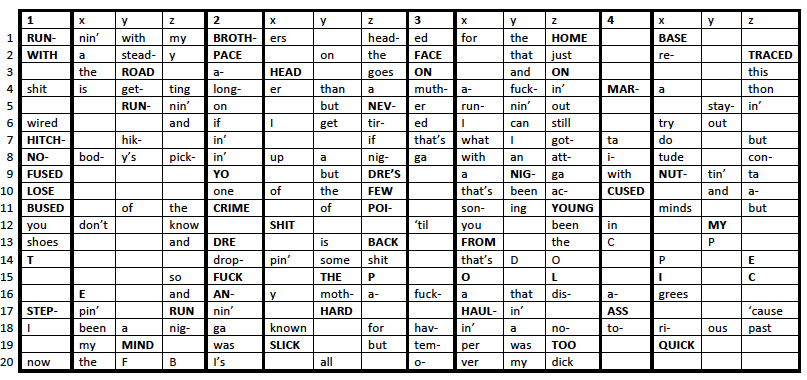 Example 8a. N.W.A., “100 Miles and Runnin’” (1990), second verse (Dr. Dre), 1:26-2:10