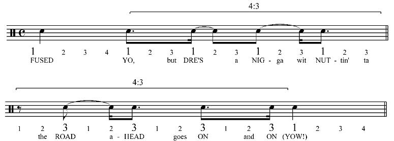 Example 9. N.W.A., “100 Miles and Runnin’,” verse 2, placement of accented syllables in mm. 9 (top) and 3