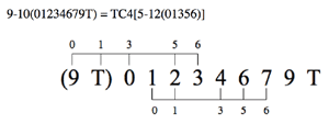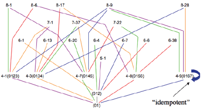 Pruning: | At each cardinality, only those TC operations producing new scs are shown.(2) For example, TC 1 of (012) would result in (0123). However, this relationship is not shown since (0123) was already produced at an earlier cardinality level (i.e., TC 2 of (01)). The only exceptions to this pruning practice are those scs that turn into themselves at any TC level. These “idempotent” scs (as Cohn calls them) are represented with a curved arrow. |