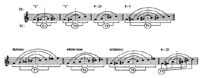 [6] Examples 5-9 present lattices for the remaining dyads. While the pruning process described above does not allow for illustrations of all TC paths, the individual lattices do reveal some relationships worth mentioning. For example, Lattice 1 (Example 4) shows a single path to 6-20 (the hexatonic collection), which then blossoms with three different paths to 9-12 (i.e., three augmented triads), two paths straight to the aggregate, and one idempotent transformation. In Lattice 2 (Example 5), TC 2 then TC 6 generates the whole-tone collection (6-35), which then maps onto itself at the three even TC levels and straight to the aggregate at the odd TC levels. Each of the five tetrachords generated in Lattice 3 (Example 6) has at least one mapping that leads to the octatonic collection (8-28). Not surprisingly, Lattice 4 (Example 7) is dominated by the clear path from the augmented triad, to the hexatonic collection (6-20), and on to 9-12, with its three augmented triads. And finally, Lattice 6 (Example 9) generates only collections that are idempotent on at least one TC level.