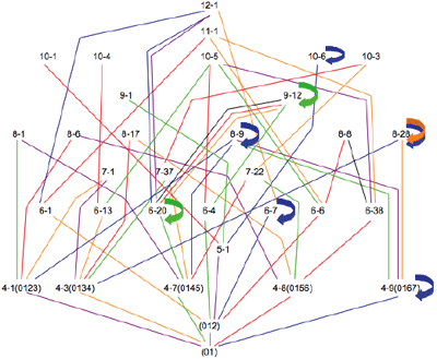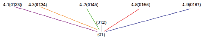 Colors: | Each TC operation is assigned a color as follows: TC 1 = black; TC 2 = purple; TC 3 = orange; TC 4 = green; TC 5 = red; TC 6 = blue. (This color scheme is shown in the lower right-hand corner of each illustration.) A colored line then connects a smaller set with the larger set that results when the smaller set undergoes a TC operation. For example, TC 3 (orange) of (01) results in (0134). Thus, an orange line will connect (01) to (0134). |